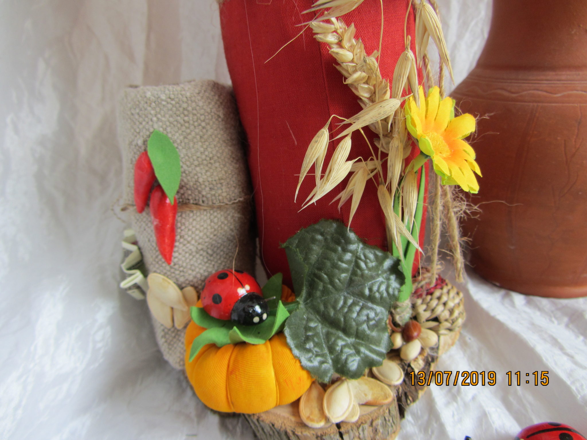 Материалы: мешковина, ткань, синтепон, чулок, мех, декоративные элементы, древесный спил.